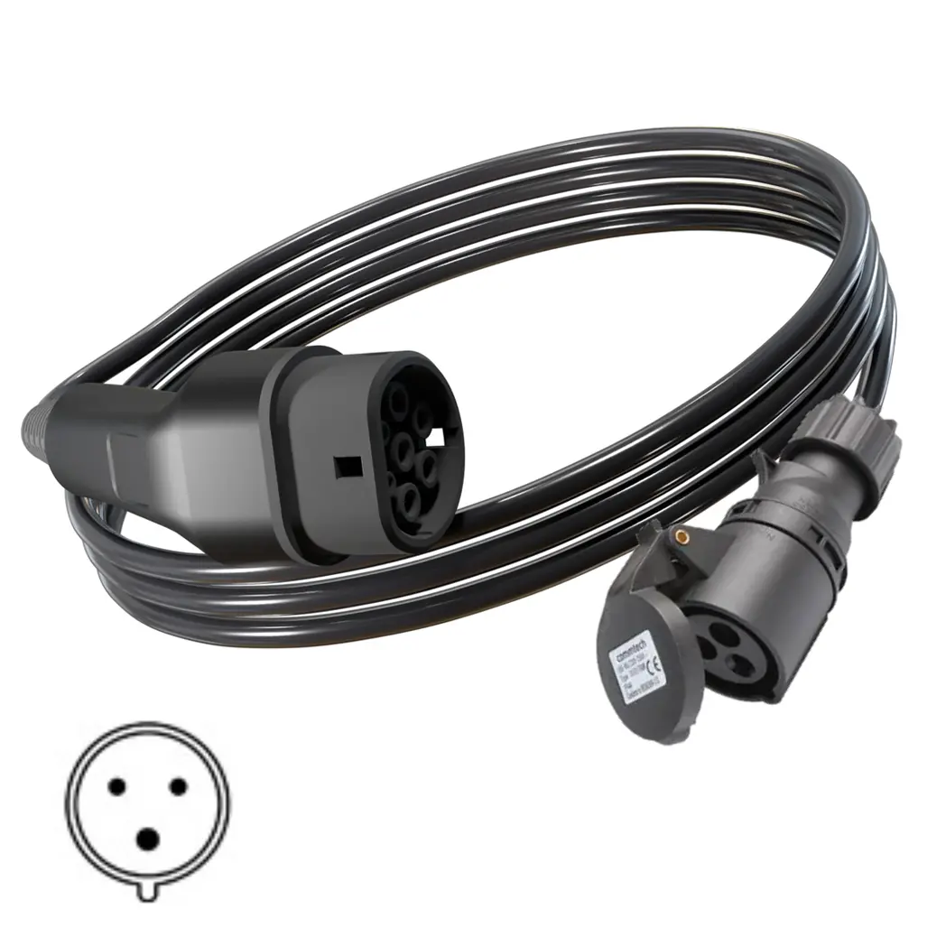 Typ-2-zu-V2L-CEE-Ladekabel 16 A, 1-phasig, mit einer 3-poligen 16-A-CEE-Steckdose (Commando-Steckdose), die an ein E-GMP-fähiges, V2L-kompatibles (Vehicle to Load) Genesis-Elektrofahrzeug angeschlossen werden kann, um als Stromanschluss für Wohnmobile, Wohnwagen, Camper oder andere Geräte mit einem 1-phasigen 16-A-CEE-Stecker zu dienen. Genesis-Modelle, die V2L unterstützen, sind der Genesis GV60, Genesis GV70 und Genesis GV80. Bitte überprüfen Sie, ob Ihr Fahrzeug V2L unterstützt, da nicht alle Modellvarianten V2L-fähig sind. Wenn Sie sich nicht sicher sind, kontaktieren Sie uns bitte unter Angabe des Modells und des Baujahres Ihres Fahrzeugs.